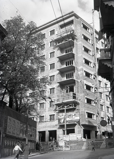 Riproduzione fotografica di un cartellone pubblicitario della Soc. commerciale Kozmann (impianti sanitari e igienici) su uno stabile in costruzione in via Udine.