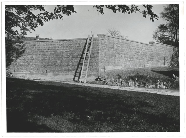 Parte interna edificio e giardino. Muro recinzione.