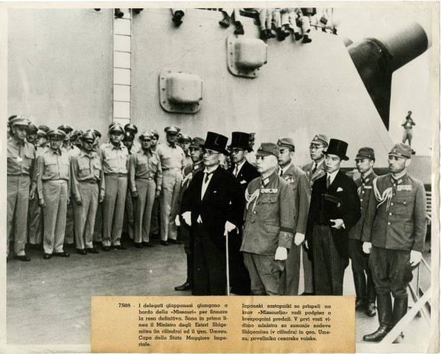 La delegazione giapponese, guidata dal Ministro degli Affari Esteri Mamoru Shigemitsu e dal Generale Yoshijirō si trova sul ponte della nave americana Missouri per firmare la resa del Paese nel settembre 1945.