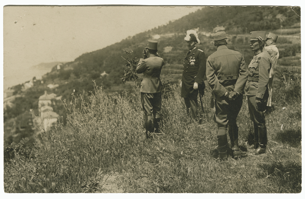 L'imperatore Carlo d'Asburgo osserva col cannocchiale il fronte da un'altura sopra Barcola. Alla sua destra, in alta uniforme, lo accompagna il luogotenente barone Alfred de Fries-Skene, l'ultimo a destra, coi baffi, è il generale feldmaresciallo Svetozar Boroevic von Bojna (vedi: Trieste 1900-1999. Cent'anni di storia, Trieste, Publisport, 1998, v. 2, p. 79) Figlio (Persenbeug 1887 - Funchal, Madera, 1922) dell'arciduca Ottone (della casa d'Asburgo-Lorena) e di Maria Giuseppa di Sassonia, nel 1911 sposò Zita di Borbone, figlia di Roberto, ultimo duca di Parma, e visse lontano dal trono, in guarnigioni di provincia, fino a quando, alla morte del cugino Francesco Ferdinando (1914), divenne l'arciduca ereditario. Succeduto il 21 nov. 1916 a Francesco Giuseppe, in piena guerra mondiale, C. (I come imperatore d'Austria, IV come re d'Ungheria) cercò di risolvere l'interno dissidio delle nazionalità mediante riforme su base federale e d'intavolare con le potenze dell'Intesa trattative di pace separata tramite il cognato Sisto di Borbone prima, il conte Revertera poi. Fallite le trattative, dovette sottostare alla sospettosa vigilanza di Berlino. Nell'imminenza del crollo militare dell'Impero, fece disperati tentativi per conservare il trono: il 1º ott. 1918 fece annunziare l'autonomia per i varî gruppi etnici, il 17 la trasformazione dell'Impero in stato federale. Costretto all'armistizio, scoppiata in Austria la rivoluzione, riparò in Ungheria (11 nov.), lasciando gli Ungheresi liberi di decidere dei loro destini, poi nella Bassa Austria e infine (24 marzo 1919) in Svizzera. Di qui fece due tentativi, nel 1921, per riacquistare il trono d'Ungheria, falliti soprattutto per l'opposizione della Piccola Intesa. Catturato durante il secondo tentativo (24 ott. 1921), fu internato nel monastero di Tihany e poi costretto a ritirarsi, con la sua numerosa famiglia, nell'isola di Madera.Tratto da Treccani on line https://www.treccani.it/enciclopedia/carlo-i-imperatore-d-austria-e-re-d-ungheria/ ultima consultazione 17.01.2025