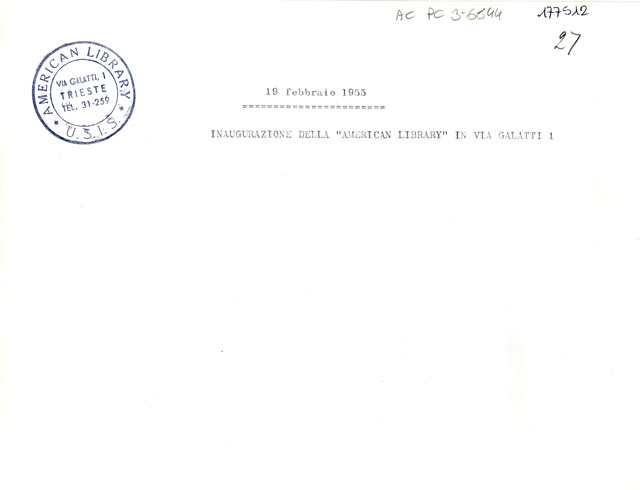 Dopo la fine dell'amministrazione del Governo Militare Alleato, la collezione americana della Sala di Pubblica Lettura viene trasferita nella sede di via Galatti 1, situata in un’ala del complesso architettonico dell’allora albergo Jolly. La sede USIS verrà definitivamente chiusa nel 1963. L’American Library, istituita anche grazie all’interessamento di Claire Luce, viene ufficialmente inaugurata alla presenza del console generale degli Stati Uniti Harold Sims e delle più alte autorità cittadine. A fare gli onori di casa, Anna Grace Banker, direttrice delle biblioteche USIS in Italia, insieme ad Alvise Barison, direttore della sede triestina.