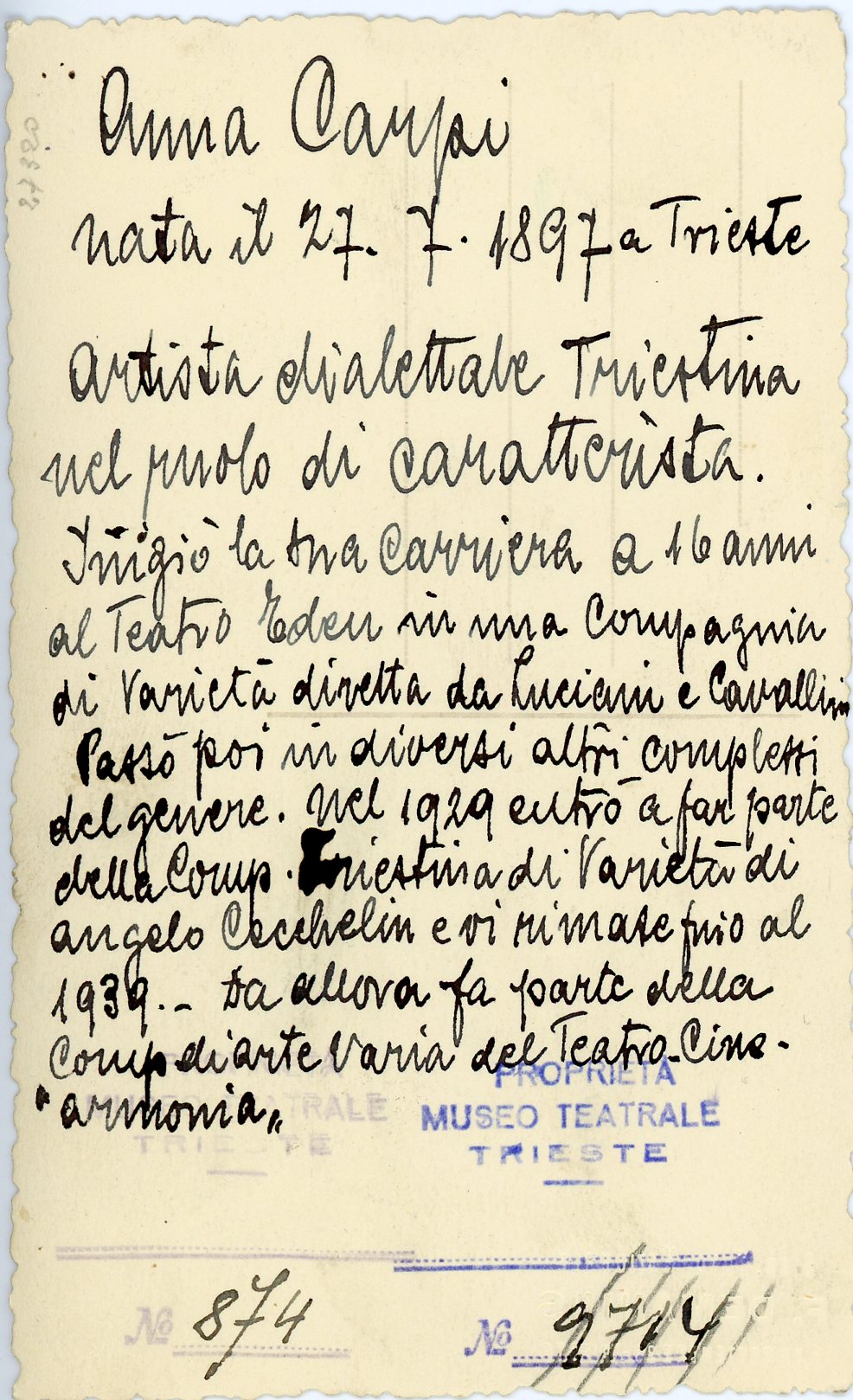 Artista dialettale triestina nata nel 1897. Inizia la carriera a 16 anni al Teatro Eden nella compagnia di Luciani e Cavallini. Dal 1929 al 1939 fa parte della compagnia di Angelo Cecchelin