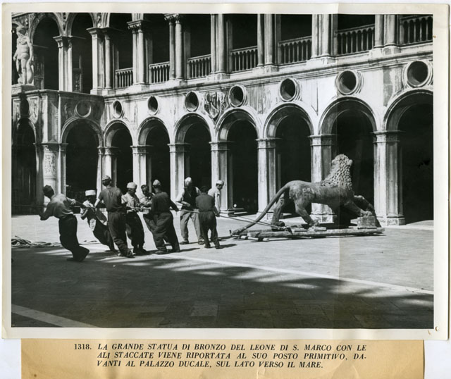 LA GRANDE STATUA DI BRONZO DEL LEONE DI S. MARCO CON LE ALI STACCATE VIENE RIPORTATA AL SUO POSTO PRIMITIVO, DAVANTI AL PALAZZO DUCALE, SUL LATO VERSO IL MARE.