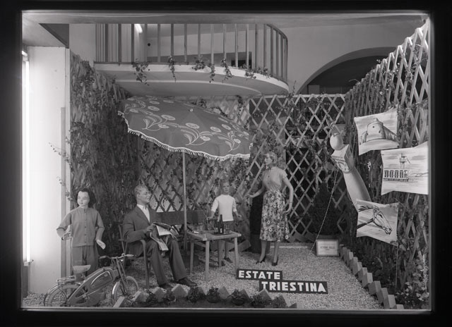 Le vetrine espongono l'ombrellone e sono titolate "Estate triestina"