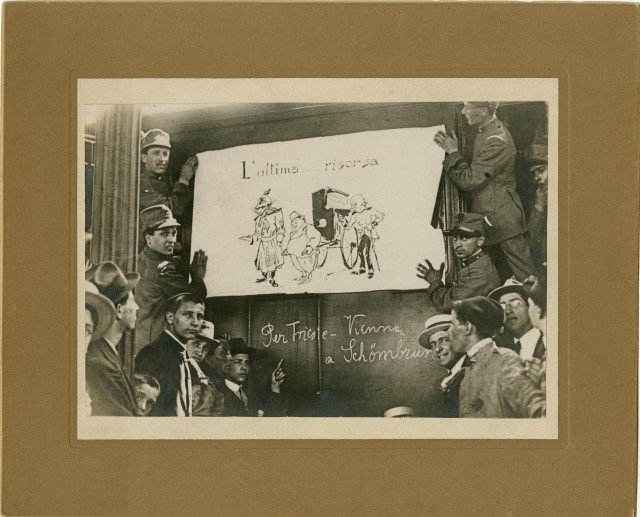 Partenza da Bologna di volontari del 35° Rgt. fanteria: reggono un manifesto con la dicitura "L'ultima risorsa"