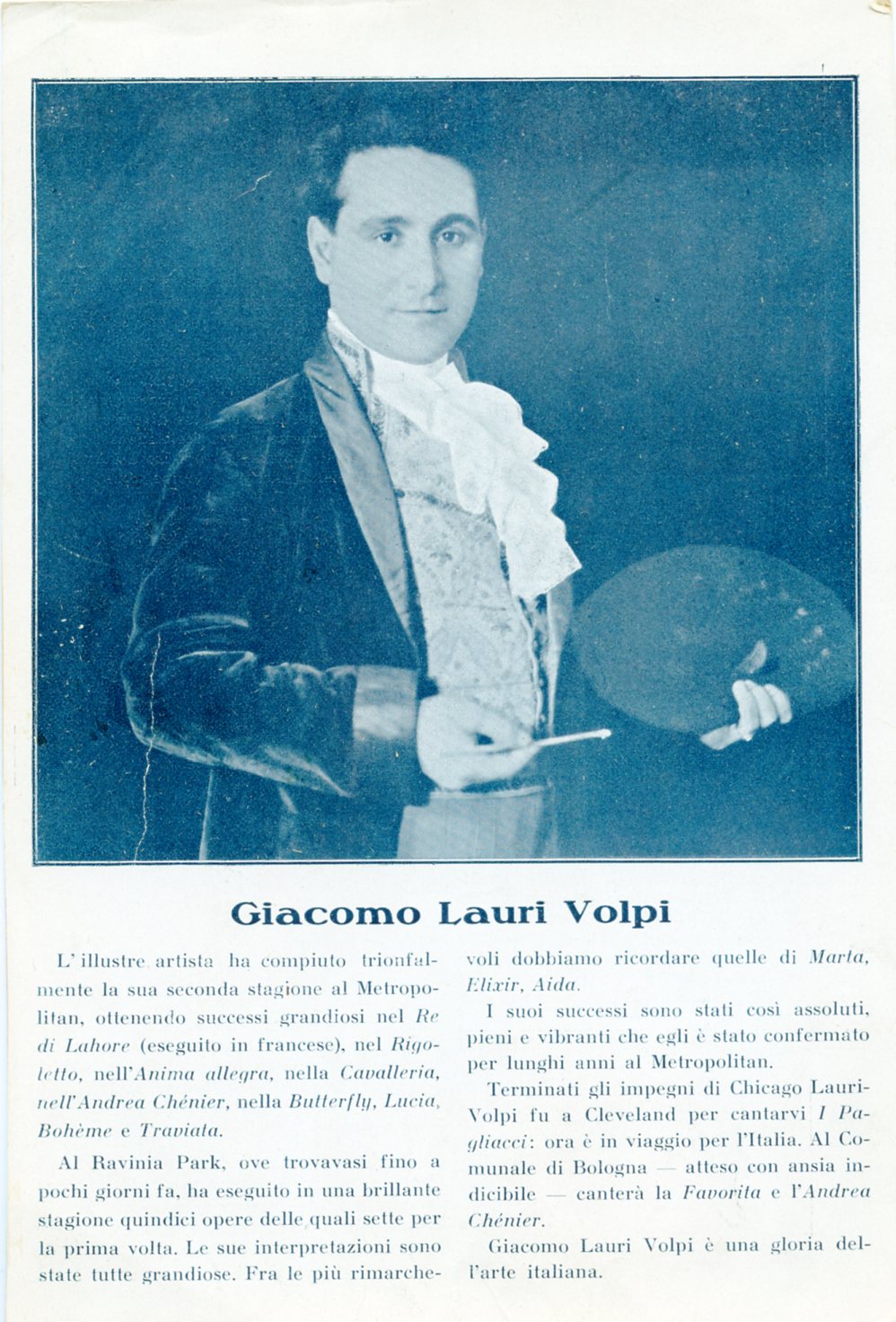 In costume nel ruolo di Cavaradossi in "Tosca". A Trieste ha cantato in "Rigoletto" al Politeama Rossetti nel 1920 e al Teatro Verdi nel 1942 ; "Andea Chenier" nel 1925 al Politeama Rossetti