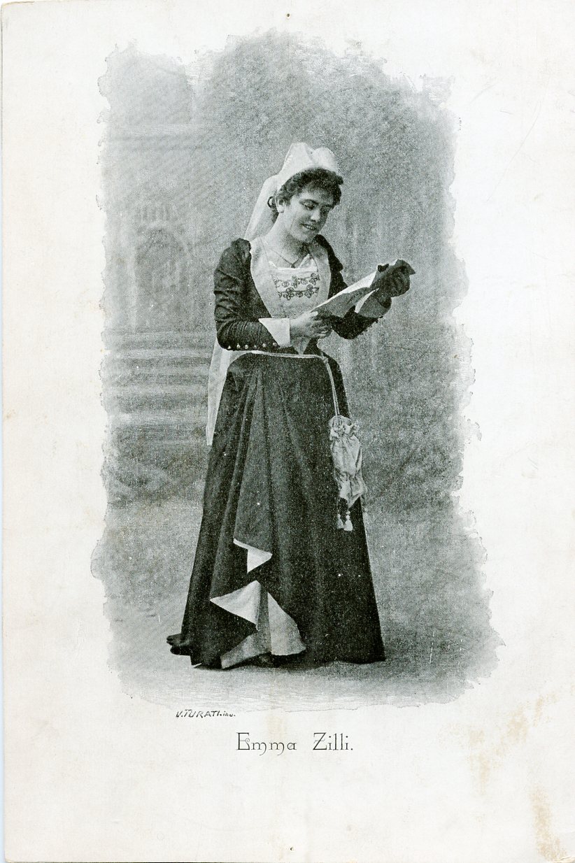 In costume nel ruolo di Alice in "Falstaff". Soprano italiano, particolarmente nota per avere creato il personaggio di Alice nel Falstaff di Giuseppe Verdi. Si esibì a Trieste nel 1892 al Politeama Rossetti in "Mefistofele", nel 1893 al Comunale in "Falstaff" e nel 1894 all'Anfiteatro Fenice.