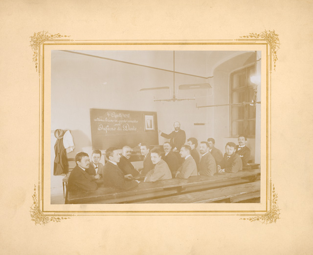 Gruppo di allievi con Filippo Zamboni: ultima lezione in questo semestre sull'Inferno di Dante: Vienna 4 aprile 1892