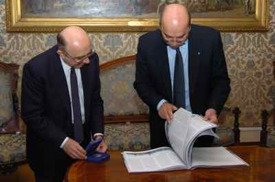 Il sindaco Roberto Dipiazza durante l'incontro con il Soprintendente ai Beni e Attivita' Culturali Giangiacomo Martines, avvenuto nel salotto azzurro del Municipio.