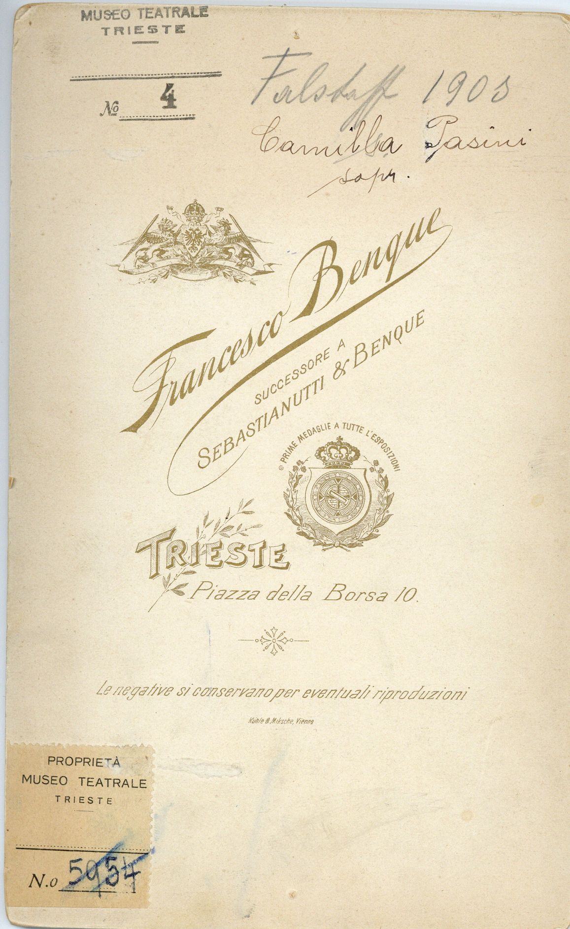 Ritratta in costume di scena nel ruolo di Alice in Falstaff. Soprano sorella di Lina Pasini Vitale celebre soprano wagneriano e di Enrica Pasini, studia a Roma all'Accademia di Santa Cecilia ove debutta al Teatro Quirino.