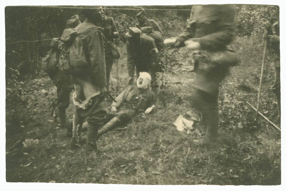 Un ferito dopo le prime cure viene trasportato sul carro ambulanza. Tra l'8 e il 20 agosto 1917 il Reggimento Ulani n. 12 prende parte alla seconda Battaglia di Oituz