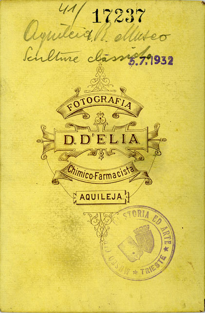In primo piano vi è il volto di una figura femminile, forse da identificare con Afrodite Anadiomene per la presenza della benda tra i capelli, su piedistallo. La scultura, realizzata in marmo alabastrino, è spezzata alla base del collo ed è consunta in più punti. L'irregolarità di alcuni tratti del volto fanno addirittura ipotizzare che essa possa essere stata rilavorata in un secondo tempo con intento iconografico. Dietro alla testa si riconosce un rilievo architettonico fortemente aggettante con un'ampia voluta vegetale terminante con un fiore a quattro petali. La foto fu scattata al museo di Aquileia, come cita la didascalia, prima che il volto femminile venisse inviato a Vienna, al Kunsthistorisches Museum, dove ancora oggi si trova.