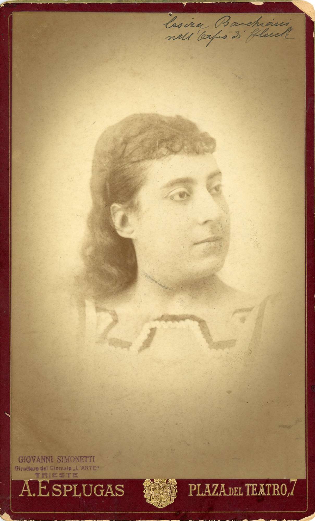In costume: interprete di Orfeo in "Orfeo ed Euridice" di Gluck a Barcellona nel 1885. A Trieste si esibì al Politeama Rossetti nel 1880: in "Nabucco" (Fenena), "Rigoletto (Maddalena), "Jone" di E.Petrella (Nidia).