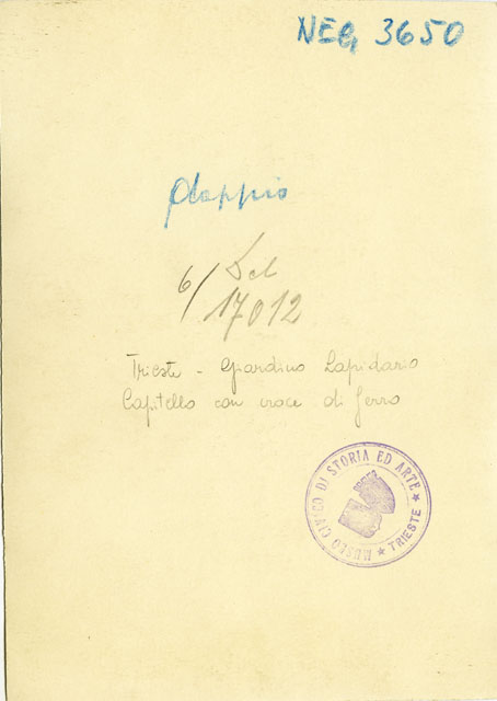 Capitello romano frammentario conservato presso l'Orto Lapidario del Museo di Storia ed Arte di Trieste. Sulla sommità del capitello è infissa una croce di ferro.