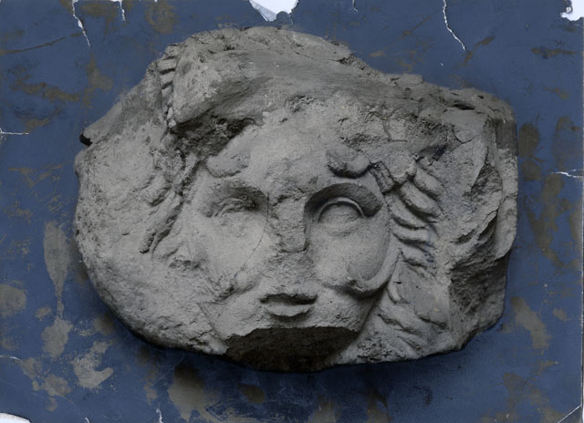Rilievo con testa di Medusa trovato reimpiegato nel campanile della cattedrale di San Giusto. Il rilievo decorava un plinto posto nella basilica civile o più probabilmente nel foro. Il sistema architettonico di cui faceva parte prevedeva plinti ornati con Medusa alternati a plinti con Giove Ammone, secondo una successione documentata anche nel foro della vicina Aquileia. L'opera si data alla metà del II sec. d.C.