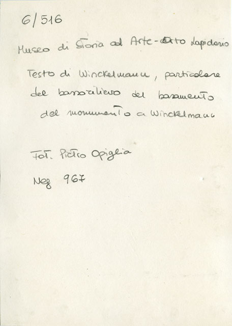 Particolare del rilievo posto alla base del cenotafio di Johann Joachim Winckelmann (Stendal, 9 dicembre 1717 - Trieste, 8 giugno 1768) situato presso l'Orto Lapidario di Trieste. Il monumento, fortemente voluto da Domenico Rossetti per onorare la memoria dello studioso tedesco che morì assassinato a Trieste mentre era in attesa dell'imbarco per proseguire il suo viaggio da Vienna a Roma, fu realizzato dallo scultore Antonio Bosa a seguito dell'approvazione del progetto da parte di Antonio Canova e venne inaugurato il primo marzo 1833. Il cenotafio è costituito da un sarcofago su cui è adagiato un genio malinconico che si appoggia con l'avambraccio su un tondo contenente il ritratto del defunto. Alla base vi è un rilevo con un filosofo togato, visibile nella fotografia, probabilmente da identificare con lo stesso Winckelmann, che indica le antichità alle personificazioni delle Arti (Pittura, Scultura, Architettura), seguite da Storia, Critica, Filosofia e Archeologia.