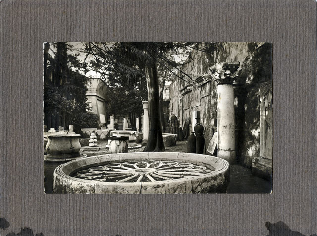 Il ripiano superiore dell'Orto lapidario del Museo di Storia ed Arte di Trieste con il materiale medievale/moderno. In primo piano il rosone gotico della chiesa di San Pietro costruita nel Trecento in Piazza Grande (l'attuale Piazza Unità) e demolita nel 1870. Il rosone, dopo esser stato depositato all'Orto lapidario, è stato riutilizzato per ornare la facciata della chiesa di San Bartolomeo di Barcola, dove tuttora si può ammirare.