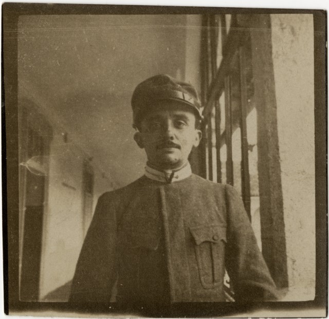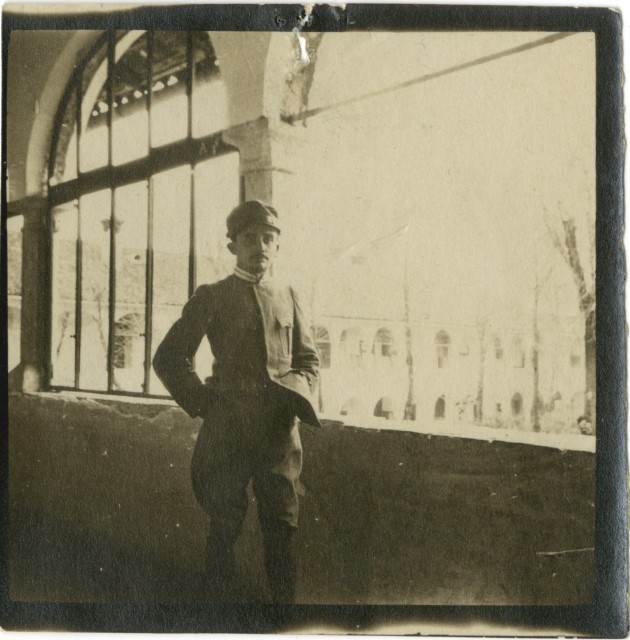 Spiro Xydias convalescente nell'ospedale di Tappa a Udine, dopo aver riportato delle ferite al volto. Spiro Tibaldo Xydias, nato a Trieste nel 1887, laureato in giurisprudenza, fu uno degli animatori del movimento irredentista a Trieste e dell'azione nazionalista. Allo scoppio del conflitto passò il confine con Ruggero Timeus e si trasferì a Roma ove, il 24 maggio 1915, si arruolò nell'81° Reggimento fanteria. Si distinse in vari combattimenti e cadde il 14 agosto 1916 sul Nad Logem, al comando di una sezione mitragliatrici.