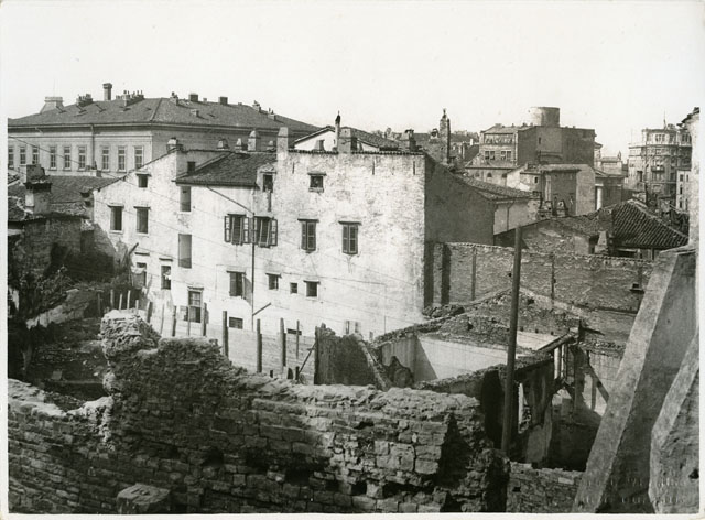 Prime demolizioni degli edifici sorti sui resti del teatro romano in Cittavecchia nelle zone di Riborgo e Donota. La foto è stata scattata da via Donota e inquadra le prime operazioni di sbancamento intraprese nel 1937. In primo piano, in basso, è visibile il tratto del muro perimetrale (tratto sud-ovest) della cavea emerso nel corso dei sondaggi condotti nel 1934 a seguito dell'approvazione del piano regolatore. Oltre il muro, si sta procedendo alla demolizione delle case costruite nell'area anticamente occupata dalla cavea del teatro. Lo sbancamento della zona, condotto in due soli anni, dal 1937 al 1938, permetterà di mettere in luce il monumento nella sua intera estensione. La presentazione ufficiale del teatro alla cittadinanza avverrà il 21 aprile del 1938 mentre l'inaugurazione ufficiale sarà celebrata dal duce il 18 settembre del 1938.