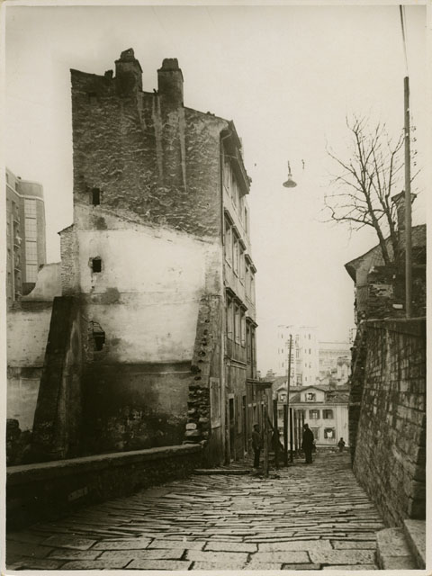 Demolizioni degli edifici collocati nell'area interessata dai resti del teatro romano, corrispondente alle zone di Riborgo e Donota in Cittavecchia. La foto riprende, in particolare, la posa dei pali per la demolizione dell'abitazione che insiste sull'area anticamente occupata dal muro perimetrale (tratto sud) della cavea del teatro.