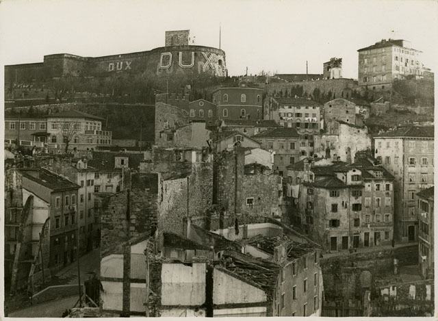 Prime demolizioni in Cittavecchia, nelle zone di Riborgo e Donota, per lo scavo del teatro romano. Del monumento è visibile, sulla destra, il tratto del muro perimetrale (tratto sud) messo in luce nel 1934 durante le prime operazioni di sventramento avvenute sotto la direzione del podestà Enrico Salem a seguito dell'approvazione del piano regolatore.
