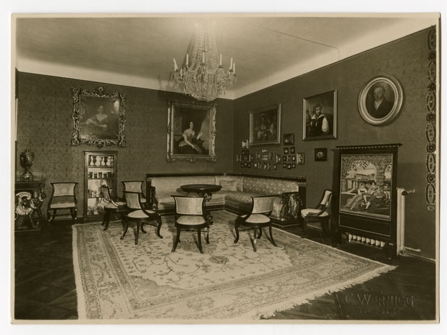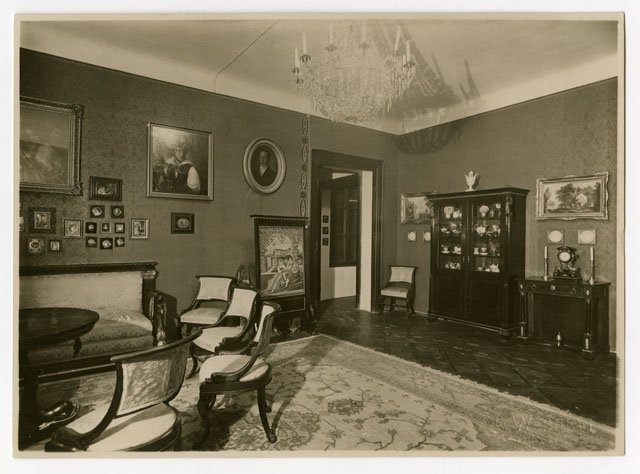 Mostra La casa dei nostri nonni : grande salone stile impero, camera da letto stile impero, anticamera, salottino di musica Biedermeier, salottino, salotto Biedermeier, camera da pranzo stile impero, salotto Biedermeier