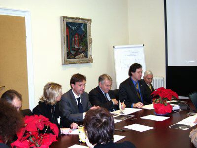 Gli assessori comunali Maurizio Bradaschia, Roberto Menia e Giorgio Rossi con il progettista Mosè Ricci durante la conferenza stampa
