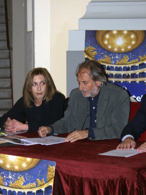 Il sindaco di Trieste Roberto Dipiazza con l'asssessore comunale Giorgio Rossi, il consigliere Paolo Rovis e l'architetto responsabile del progetto Luciano Celli durante la presentazione presso il Politeama Rossetti.