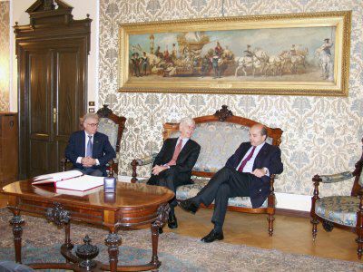 Il sindaco Roberto Dipiazza ed il presidente del Consiglio comunale Bruno Sulli durante l'incontro con il console generale di Germania Folkmar Stoecker, nel salotto azzurro del Municipio.