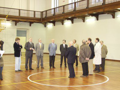 L'assessore comunale Giorgio Rossi, il consigliere Franco Bandelli ed i presidenti provinciale e regionale del Coni, Stelio Borri ed Emilio Felluga all'inaugurazione della ristrutturata palestra
