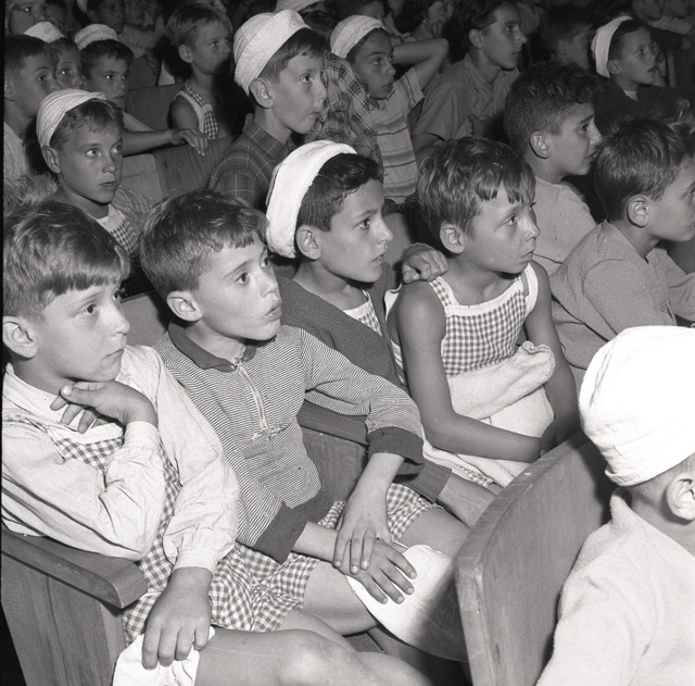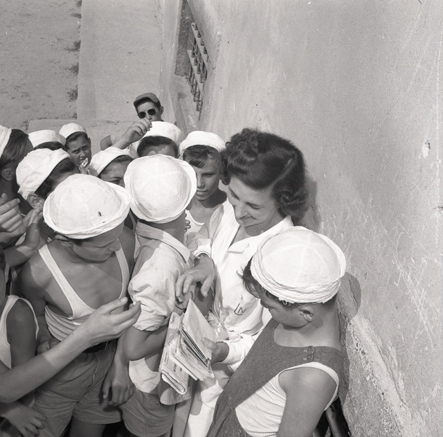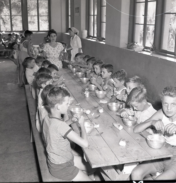 Colonia montana G. De Col della Lega nazionale a Strigno <TN>. Esterni ed interni della colonia. Cucina gestita dalle suore. Gruppi di bambini impegnati in varie attivita quotidiane e ginnico-sportive. Foto di gruppo. Folla di bambini attorno ad un furgoncino con la scritta sul fianco: "Radio Trieste"