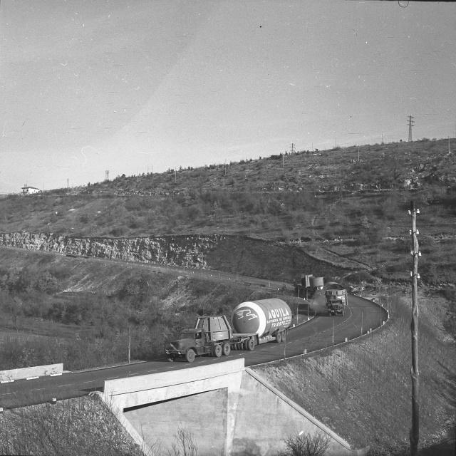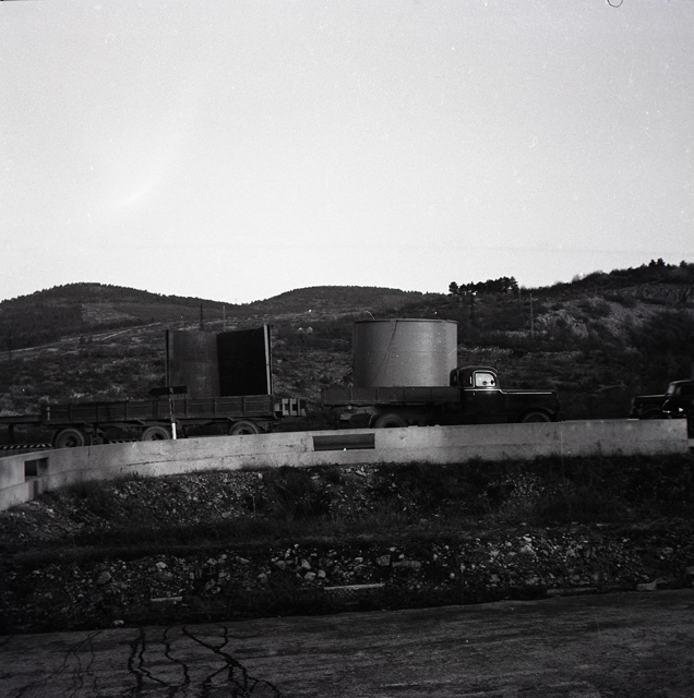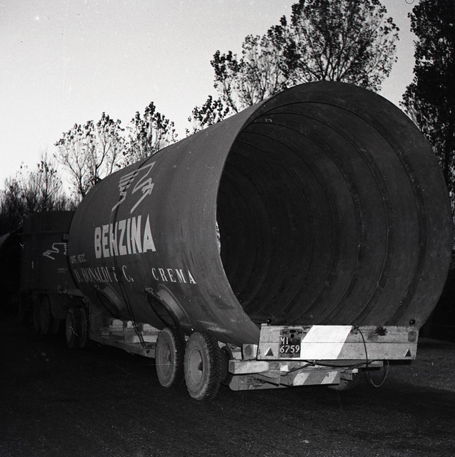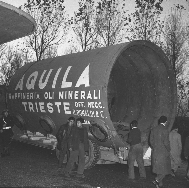 Tre camion rimorchio, giunti da Crema, trasportano un grande serbatoio destinato alla Raffineria Aquila. Il vuoto e' composto da un primo elemento lungo m 7,5 e del diametro di m 3,80, peso circa 20 tonnellate, e da un altro elemento analogo e della struttura metallica del forno. E' il primo impianto del genere costruito in Italia, su disegno di una ditta di Boston
