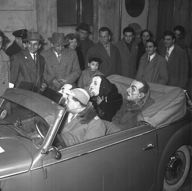 Quattro persone con i volti nascosti da maschere caricaturali, tra le quali quella di Eduardo de Filippo, percorrono una via del centro a bordo di un'automobile scoperta.
