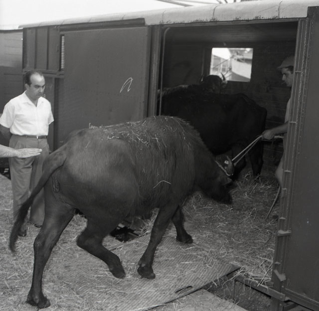 Una nave carica di bestiame proveniente dalla Turchia e diretto in Cecoslovacchia trasborda dalla stiva al vagone 290 bovini.