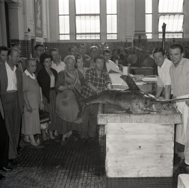 Il pesce spada catturato dal bagnino Raffaele Brecelli a Barcola viene venduto al Salone degli Incanti.