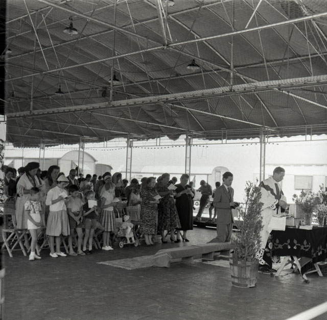 Viene celebrata una Messa sotto il tendone di un luna-park.