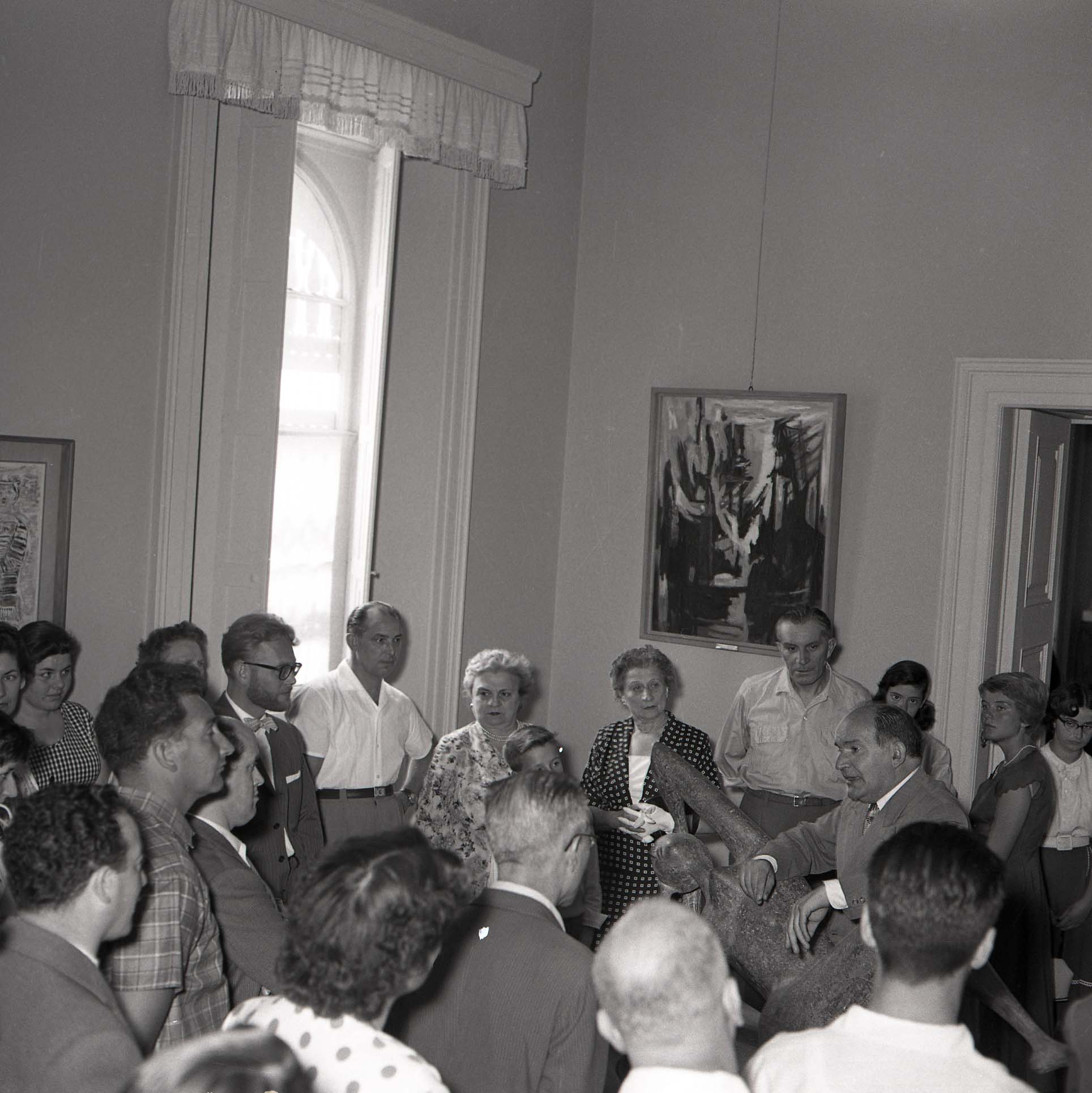 Il pittore Cesare Sofianopulo illustra una serie di opere esposte in una galleria d'arte.