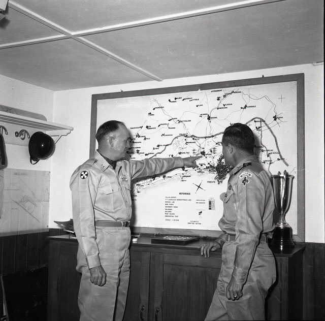 Il generale John A. Dabney, comandante delle truppe americane, predispone lo sgombero delle truppe statunitensi e viene immortalato davanti alla carta del Territorio. Il fotogramma UBNP000981_004 è pubblicato su Il Giornale di Trieste senza l'indicazione dell'autore.