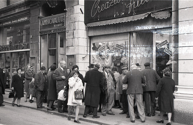 Acquirenti jugoslavi ; cambiavalute ; operaio che dipinge "divieto di sosta"