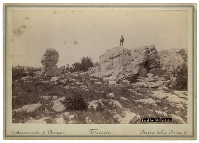 Veduta di una landa carsica presso San Canziano con grandi rocce calcaree erose dall'acqua (definiti "Karren relitto" nella bibliografia dedicata ai fenomeni carsici). La roccia isolata sulla sinistra assomiglia ad una sfinge. Su quella di destra vi è in piedi un uomo con cappello, forse un "grottenarbeiter" (lavoratore delle grotte) di San Canziano. Questa foto è la prima a comparire nel famoso volume "Hohlenkunde" (1894) di Franz Kraus dedicato alle prime esplorazioni in grotta con la didascalia "karstlandschaft nach einer Photographie von Sebastianutti & Benque" (Paesaggio carsico in una fotografia di Sebastianutti e Benque).