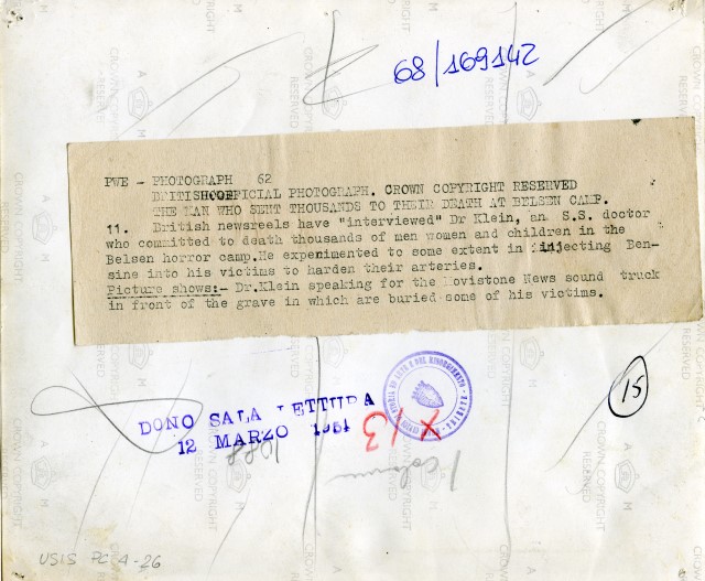Il Dr. Fritz Klein - medico del campo di concentramento, aveva condotto esperimenti sui prigionieri, ed è ripreso in piedi tra i cadaveri di una fossa comune. Bergen-Belsen, dopo il 15 aprile 1945.