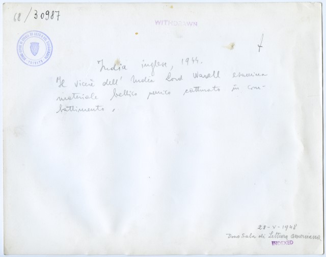Wavell, Archibald Percival, visconte di Winchester e di Cirenaica, lord. - Generale (Colchester 1883 - Londra 1950). Partecipò alla guerra contro i Boeri (1899-1902) e alla prima guerra mondiale, servendo poi in Egitto con il gen. E. H. H. Allenby e nel corpo di occupazione sul Reno (1919-20). Richiamato al War Office e inviato più tardi in Rhodesia del Sud, nel 1939 fu nominato comandante in capo delle forze britanniche nel Medio Oriente. In tale veste diresse le operazioni contro gli Italiani in Cirenaica (dic. 1940 - genn. 1941) e in AOI (genn.-maggio 1941) costringendoli alla ritirata; ma non riuscì ad arrestare l'invasione tedesca della Grecia e di Creta, né a fermare le truppe di Rommel in Nord Africa. Trasferito (luglio 1941) al comando in capo delle forze britanniche delle Indie, dovette indietreggiare di fronte all'avanzata giapponese in Malesia, Singapore e Burma. Lasciato il comando nel giugno 1943, fu promosso maresciallo di campo e nominato vicerè dell'India, carica che mantenne fino al 1947. Notizia desunta da: http://www.treccani.it/enciclopedia/wavell-archibald-percival-visconte-di-winchester-e-di-cirenaica-lord