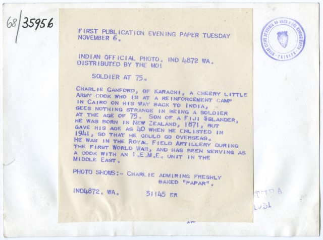 La foto rende omaggio a Charlie Ganford, di Karachi, cuoco che, dopo aver lavorato presso il Cairo, tornato in India, svolge l'attività di soldato all'età di 75 anni. Nato in Nuova Zelanda, nel 1871, nel 1941 si iscrive alle liste di leva, affermando di averne 40.