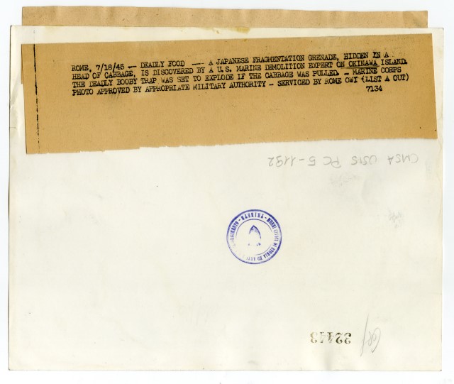 Un marinaio americano di istanza sull'isola di Okinawa mostra una granata giapponese nascosta all'interno di una pianta di cavolo.