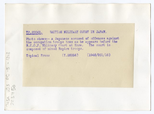 Un giapponese, accusato di attacchi contro le truppe alleate, si presenta davanti alla Corte militare inglese nella città di Kure.