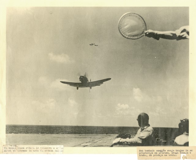 Un bombardiere americano sta riducendo la velocità per l'atterraggio, mentre altri tre sorvolano il mare.
