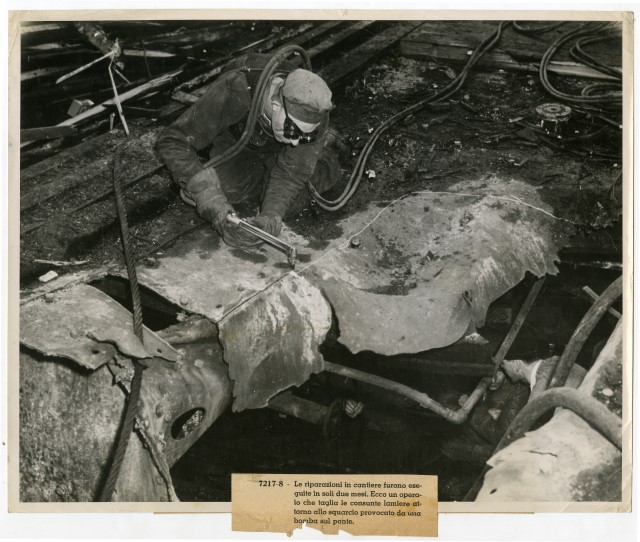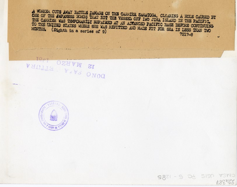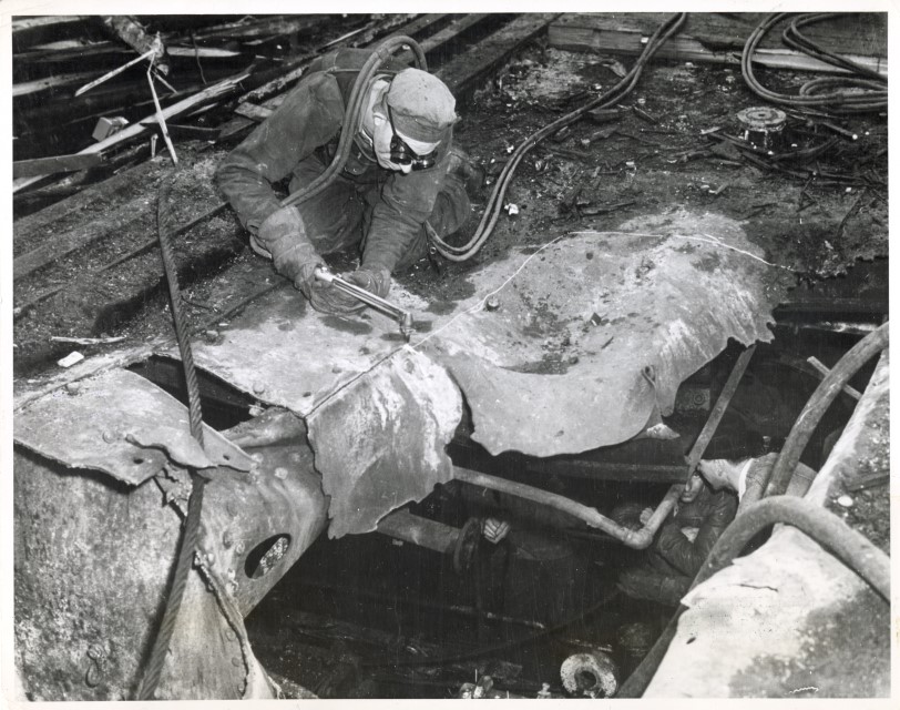 A worker cuts away battle damage on the carrier Saratoga