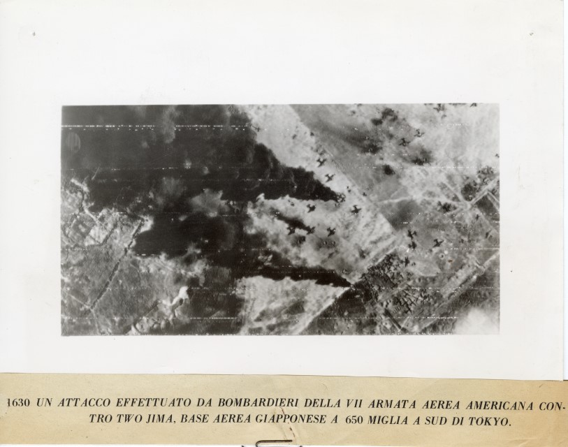 Veduta aerea del bombardamento americano alla base aerea di Iwo Jima.
