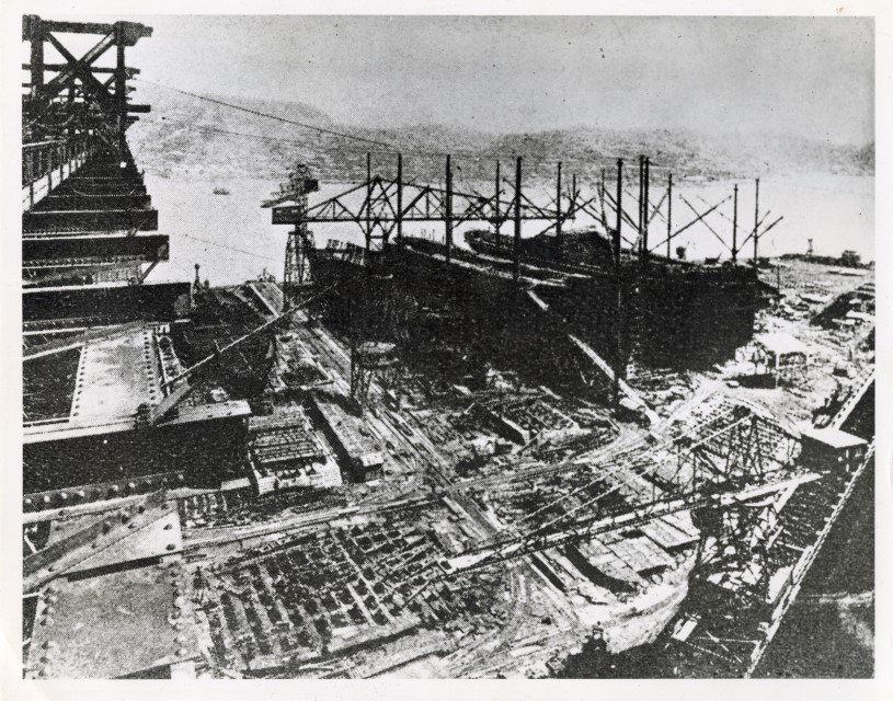 Veduta dall'alto di un cantiere navale giapponese nell'area di Nagasaki, obiettivo militare americano.