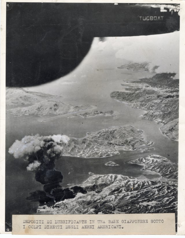 Incendio proveniente da un deposito di lubrificanti giapponesi a seguito di un attacco aereo americano ad Hong Kong.